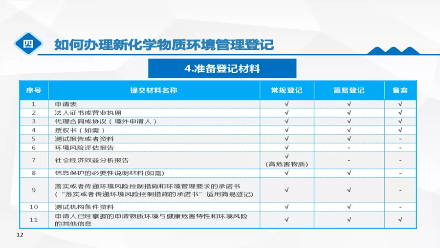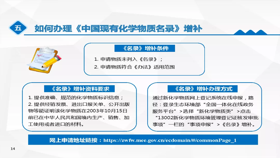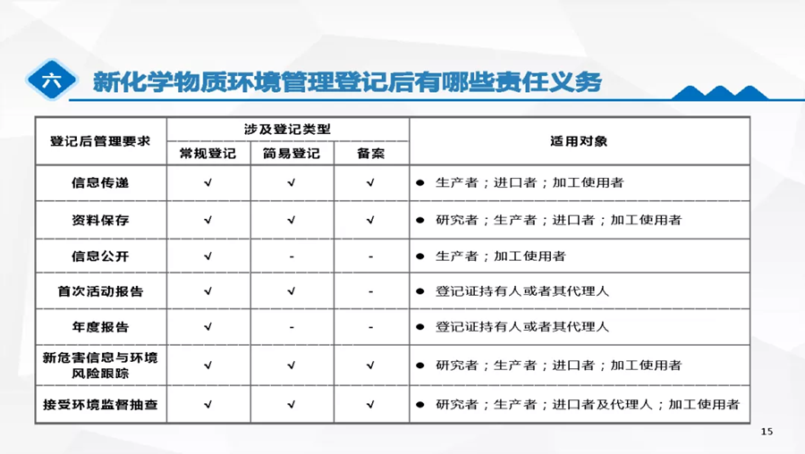 (1)首先核查企業(yè)經(jīng)營(yíng)的化學(xué)物質(zhì)是否屬于新化學(xué)物質(zhì),自查請核對MEP頒發(fā)的2013版IECSC及后續的5次公告增補列入IECSC的目錄清單,或者委托固體廢物與化學(xué)品管理技術(shù)中心(SCC)進(jìn)行查新。如果是新化學(xué)物質(zhì)或者屬于新用途管理類(lèi)的現有化學(xué)物質(zhì),建議盡快準備登記或備案。