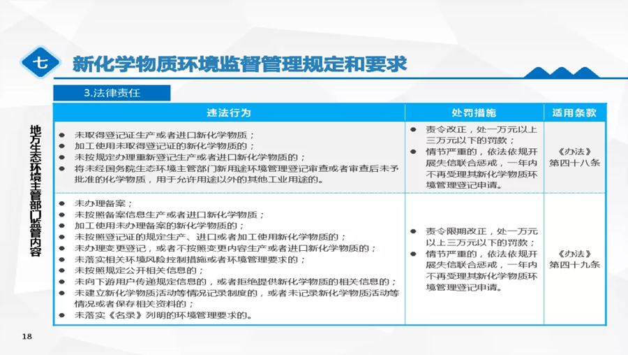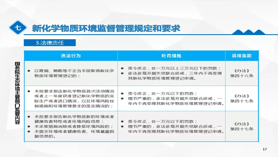 ①地方生態(tài)環(huán)境部門(mén)責令改正②處一萬(wàn)以上三萬(wàn)以下罰款③情節嚴重的,開(kāi)展失信聯(lián)合懲戒④一年內不受理其新化學(xué)物質(zhì)環(huán)境管理登記申請
